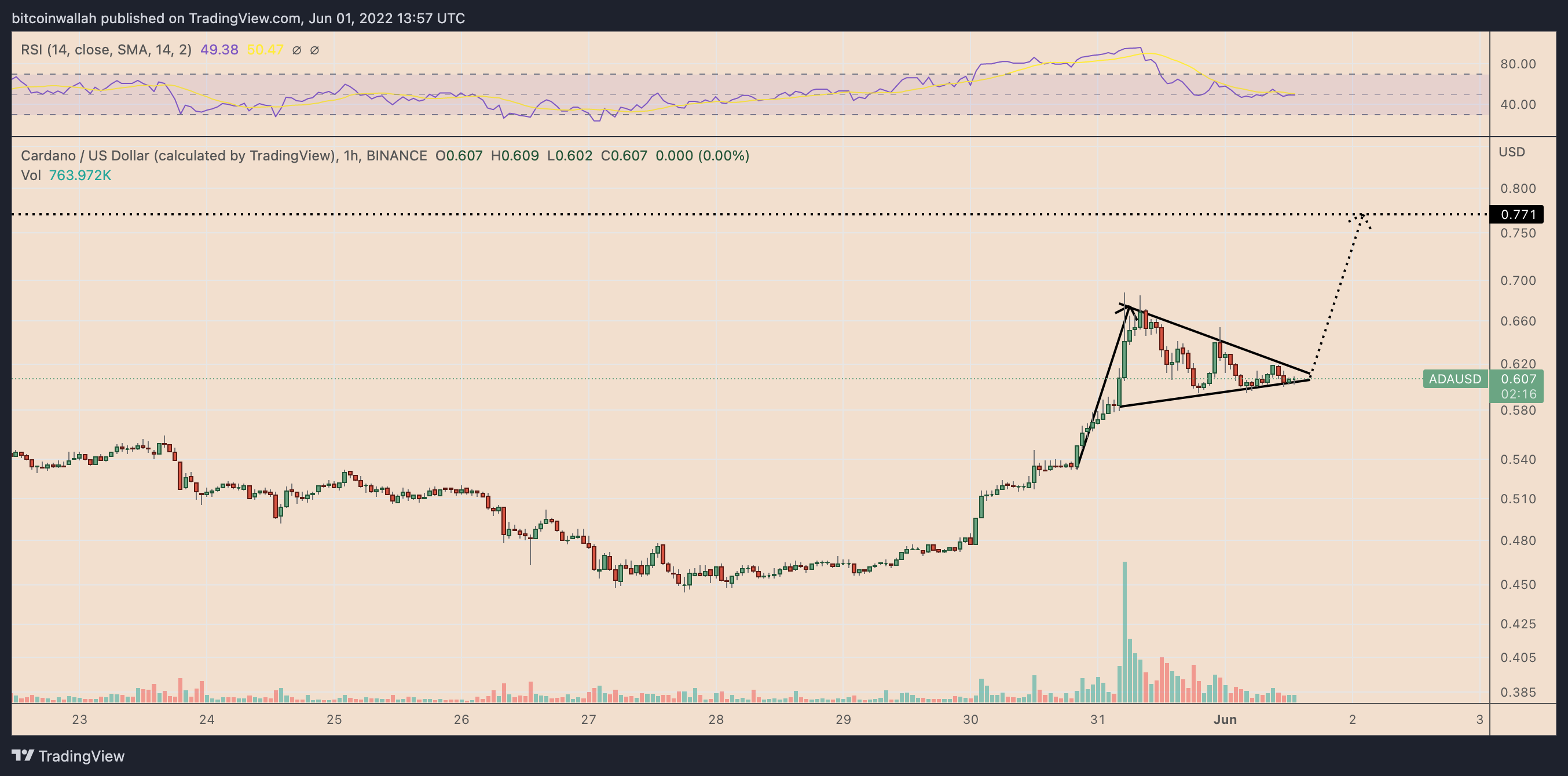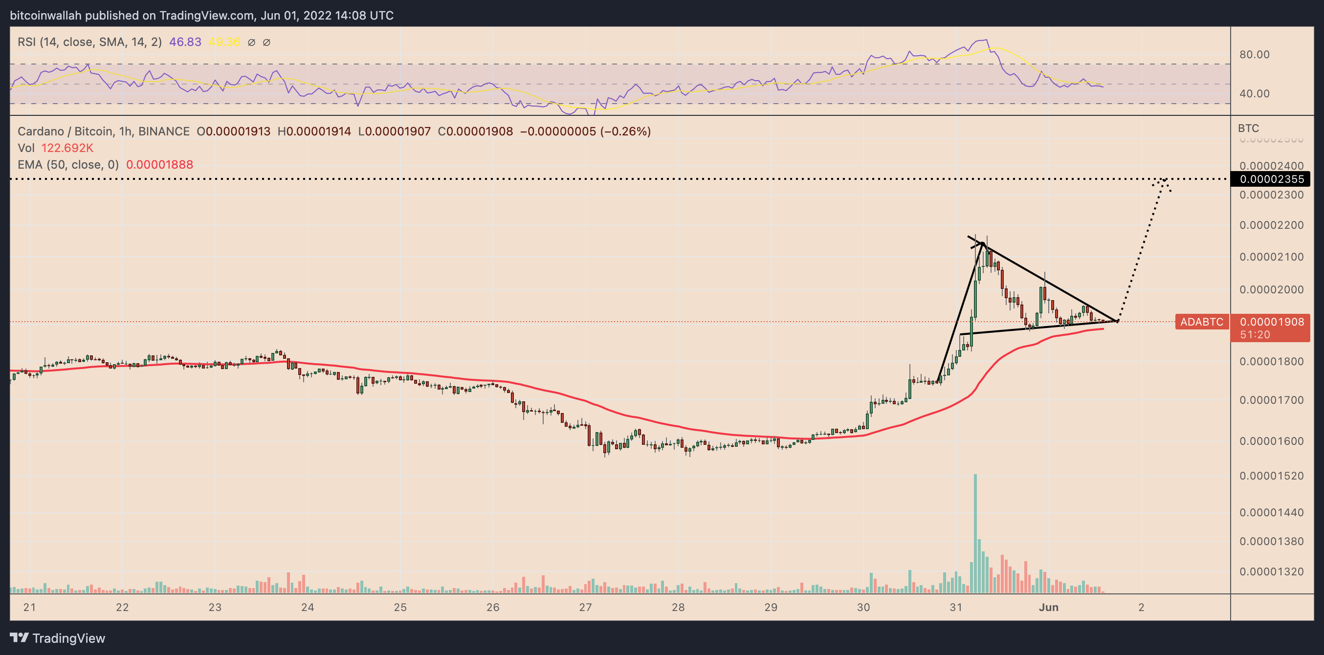 ADA has been painting a similar bull pennant setup against Bitcoin, raising the chances of an uptrend for the ADA/BTC pair in June.