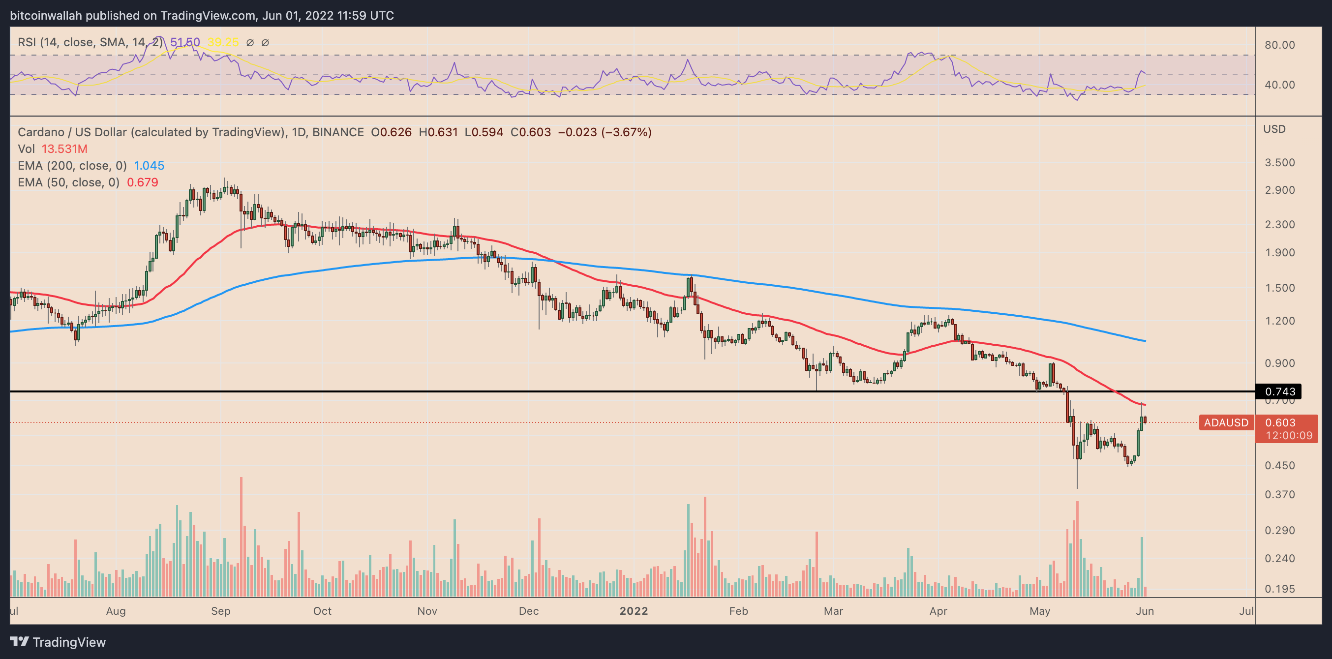 https://images.cointelegraph.com/images/840_aHR0cHM6Ly9zMy5jb2ludGVsZWdyYXBoLmNvbS91cGxvYWRzLzIwMjItMDYvYWI0Njg2OWMtZmFiOS00MDhiLWFjNGEtMjgyZmY0M2VlNjI1LmpwZw==.jpgCardano (ADA) price climbed from $0.48 on May 30 to as high as $0.68 on May 31—a 45% rally in less than 48 hours. But ADA/USD failed to extend its rally further upward and dropped by almost 13.75% from its weekly high.