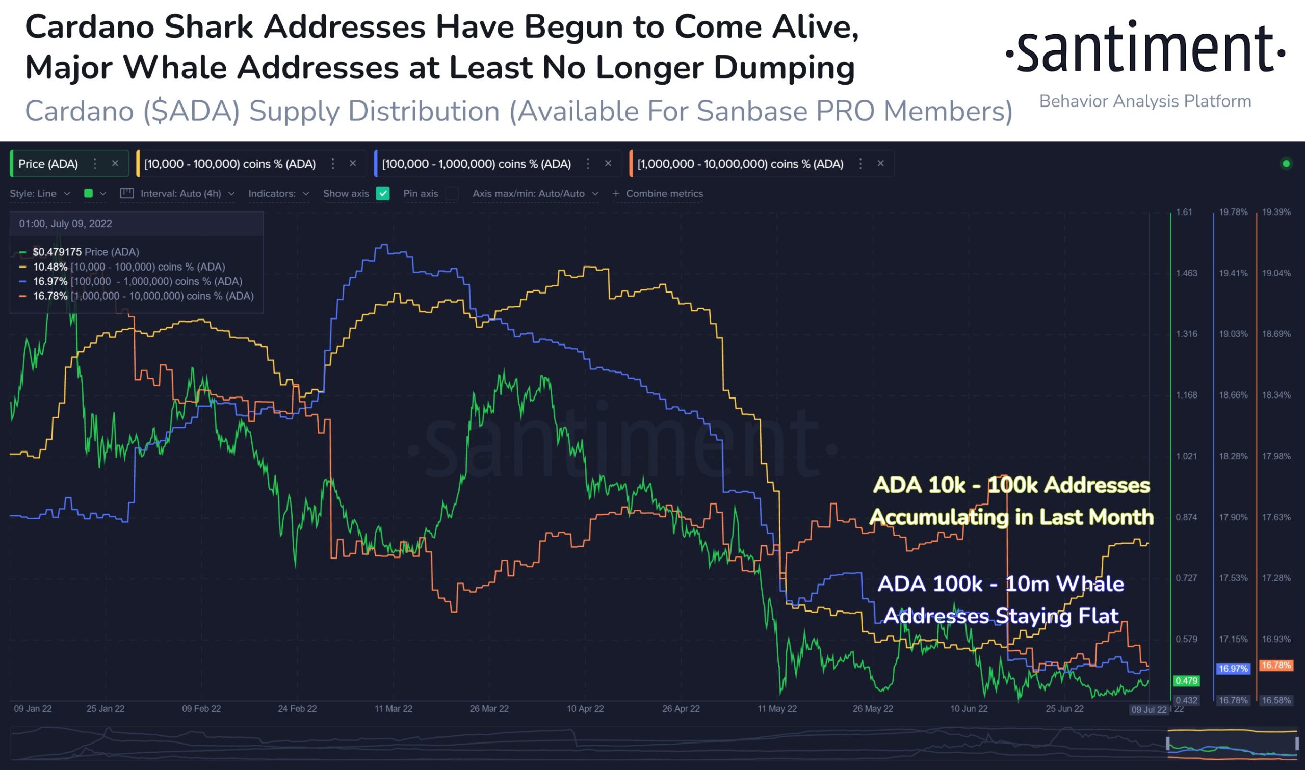 Notably, addresses holding between 10,000 and 100,000 ADA, also called “sharks,” have added 79.1 million tokens (~ $37.7 million as of July 9) to their reserves since June 9, according to data from Santiment.