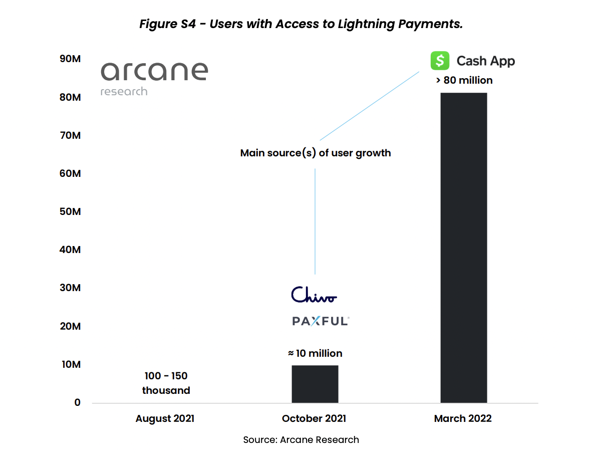 Arcane estimated that in Aug. 2021, roughly 100,000 users had access to Lightning payments. By March of this year, over 80 million people had the ability to access payments on the Lightning Network , which shows that there is a large potential user base.