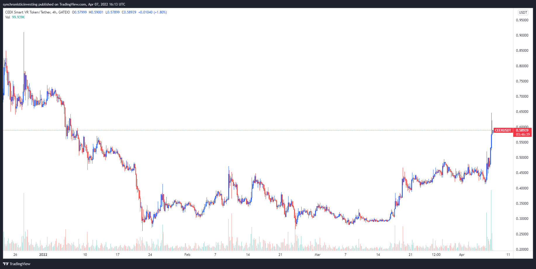 Data from Cointelegraph Markets Pro and TradingView shows that since trading at a low of $0.289 on March 15, the price of CEEK has gained 123% to hit a daily high of $0.646 on April 7 as its 24-hour trading volume spiked 178% to $90 million.