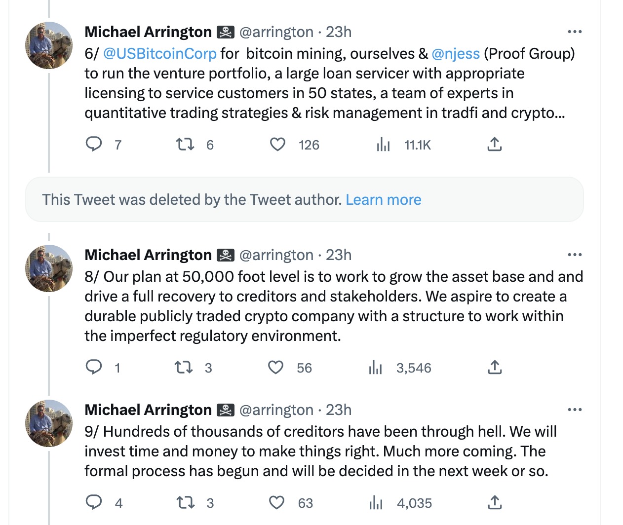 Based on Arrington’s tweets, the Fahrenheit consortium also proposes the creation of a new company “with the sole goal of growing those assets to make stakeholders whole.” The company would be run by “a group of proven crypto operators” and hold “substantial bitcoin mining assets, retail and institutional loans, a variety of crypto core assets, and a venture capital portfolio,” said Arrington.