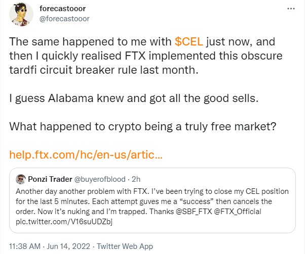 Several replies to the tweet above confirmed user difficulties when trying to sell CEL on FTX, and Twitter user Karl Larsen said that they “could only fill my shorts at 0.87–0.95.”