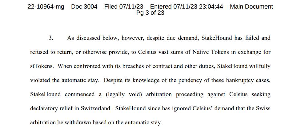 In addition, Celsius also argued in the filing that “StakeHound should be required to immediately turn over Celsius’ property” and pay compensation for damages that arose from its breaches of contractual duties.