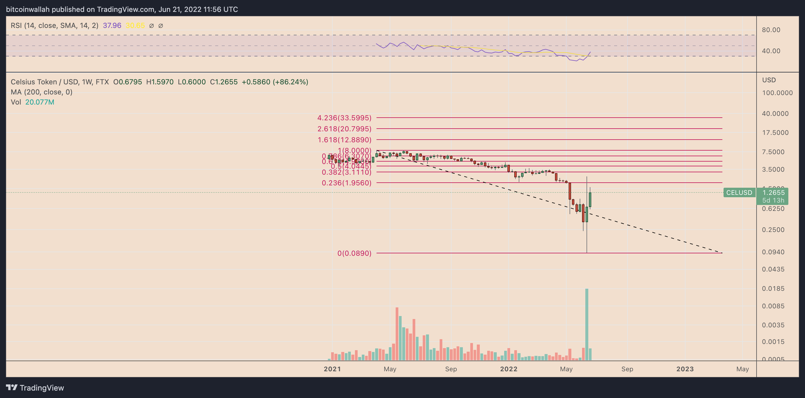 CEL, a native currency inside the Celsius ecosystem for earning interest income and paying back debts, remains under downside pressure as it trades almost 84% below its peak level of $8 in April 2021.