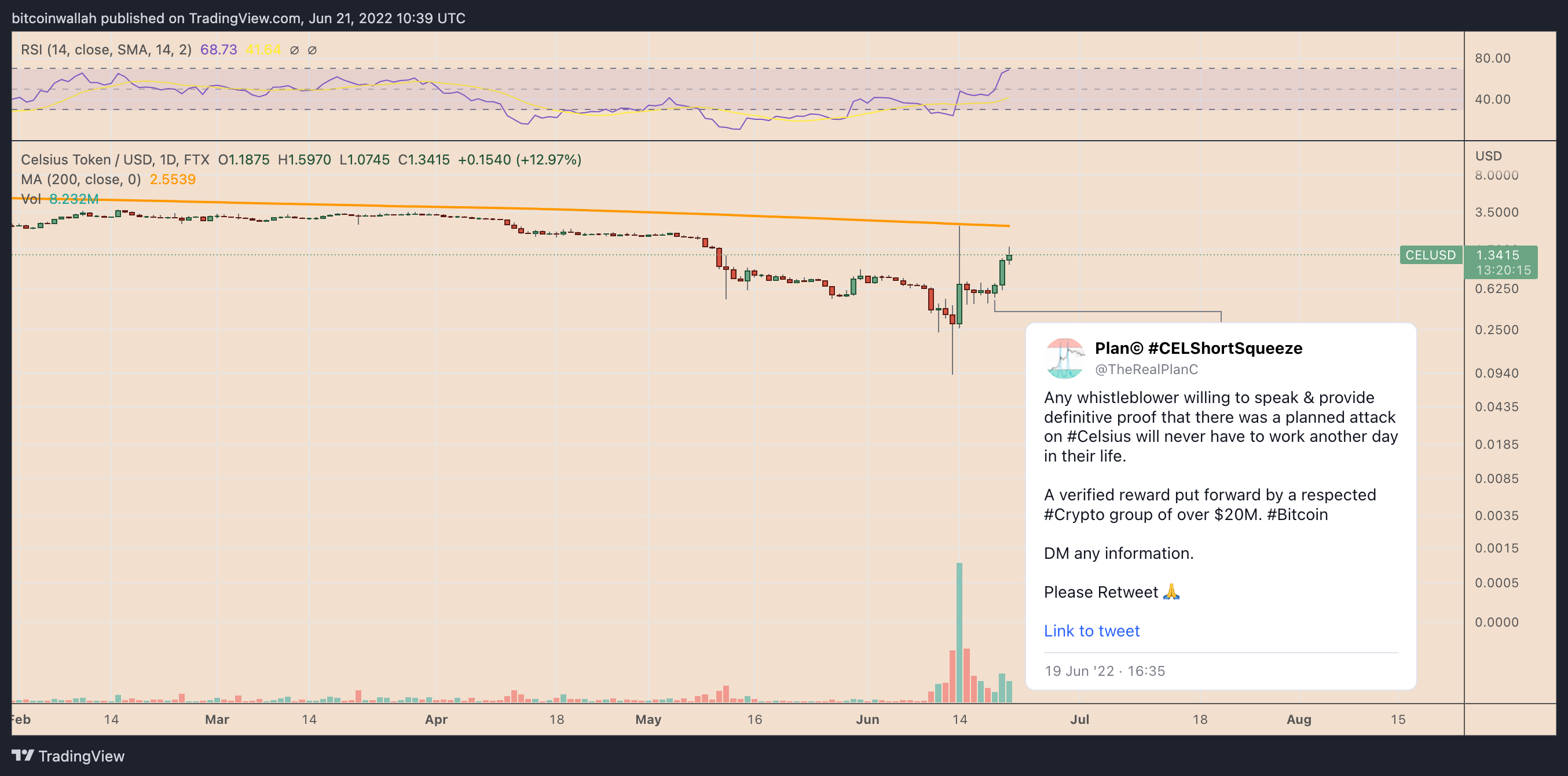 Notably, the rally started after PlanC, an independent market analyst, announced a $20 million bounty for anyone who could prove that the Celsius Network suffered a coordinated attack at the hands of a third party, which prompted the crypto lending firm to suspend withdrawals last week.