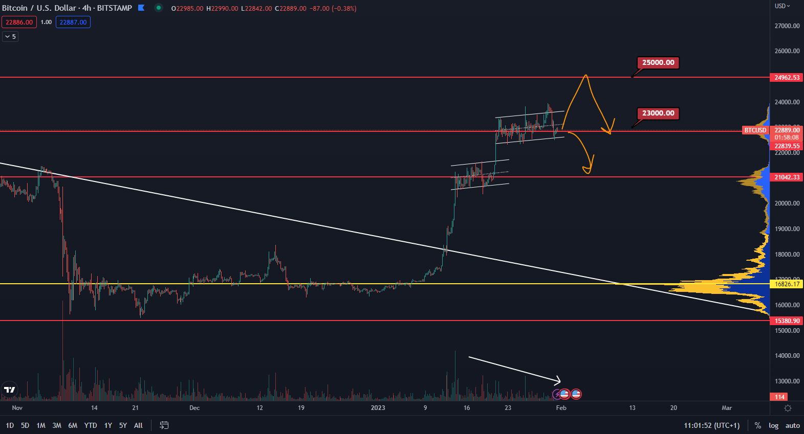 Na grafe z TradingView vidíme, že trhová cena bitcoinu sa obchoduje na úrovni 22 889 dolárov. Zároveň najvýznamnejšia hladina rezistencie je približne v pásme 25 000 dolárov a supportu v pásme 21 000 dolárov. Zatiaľ cena neukončila bočný pohyb a preto je možný dotyk oboch spomínaných cenových úrovní.