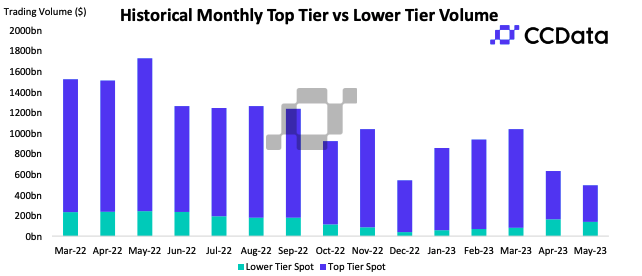 According to a June 7 report from crypto analytics firm CCData, combined spot and derivatives trading volume in May fell 15.7% from the previous month, marking the second consecutive month of dwindling crypto trading activity.