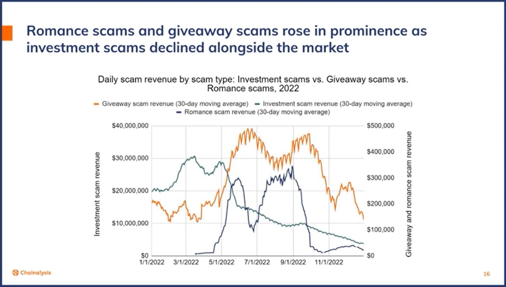 While the Terra collapse in 2022 made crypto investors skeptical of investing, scammers turned to other strategies, such as preying on greed with free giveaway scams and playing with people’s hearts through romantic scams. Jardine explained that: