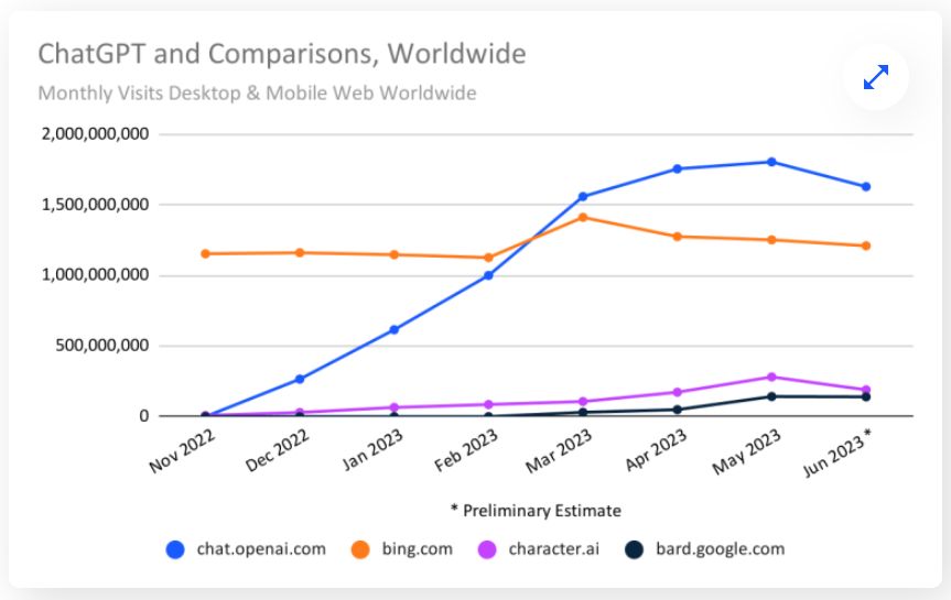 According to data estimates from the traffic analytics site Similarweb, desktop and mobile web traffic for ChatGPT dropped by 9.7% in June. In addition, the site’s unique visitors and the amount of time users spend on the site have also declined by 5.7% and 8.5% respectively. In the United States, the recorded month-on-month decline in the website’s traffic was 10.3%.