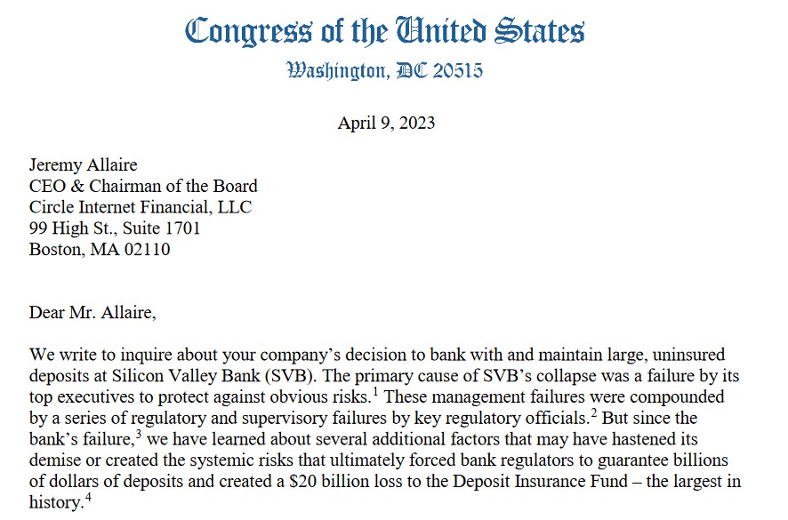 On April 9, letters from Senator Elizabeth Warren and Representative Alexandria Ocasio-Cortez (AOC) were sent to Circle, BlockFi and 12 other non-crypto tech firms asking a series of questions on each firm’s relationship with SVB.