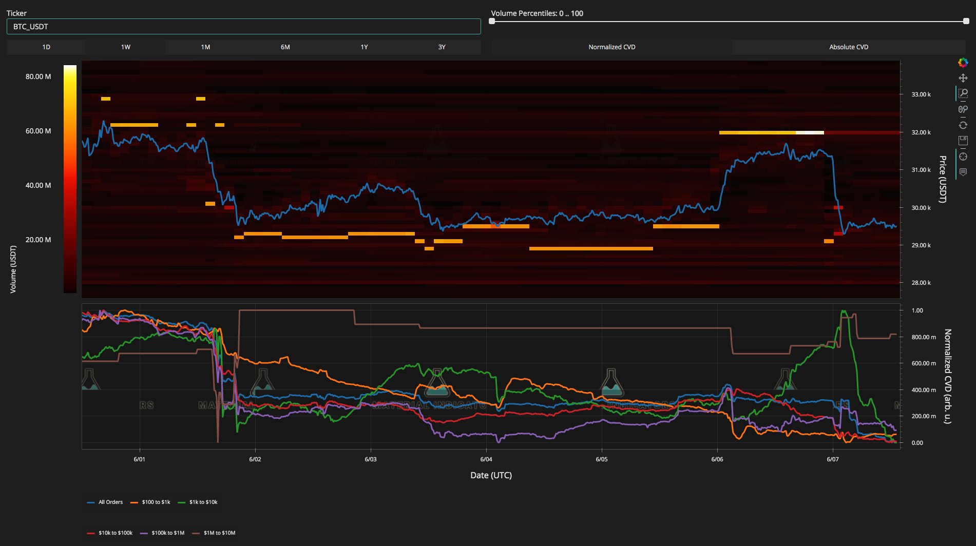 Analyzing order book data, on-chain analytics resource Material Indicators noted that a wall of bids from a whale “spoofing” the market in recent days had finally dissipated. Earlier, that entity had posted a support line at $29,000.