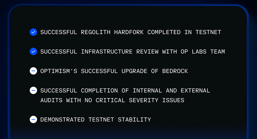 The other three criteria passed included a “Regolith” hard fork in testnet, a successful infrastructure review with OP labs — the team behind Optimism — and Optimism’s “Bedrock” upgrade.