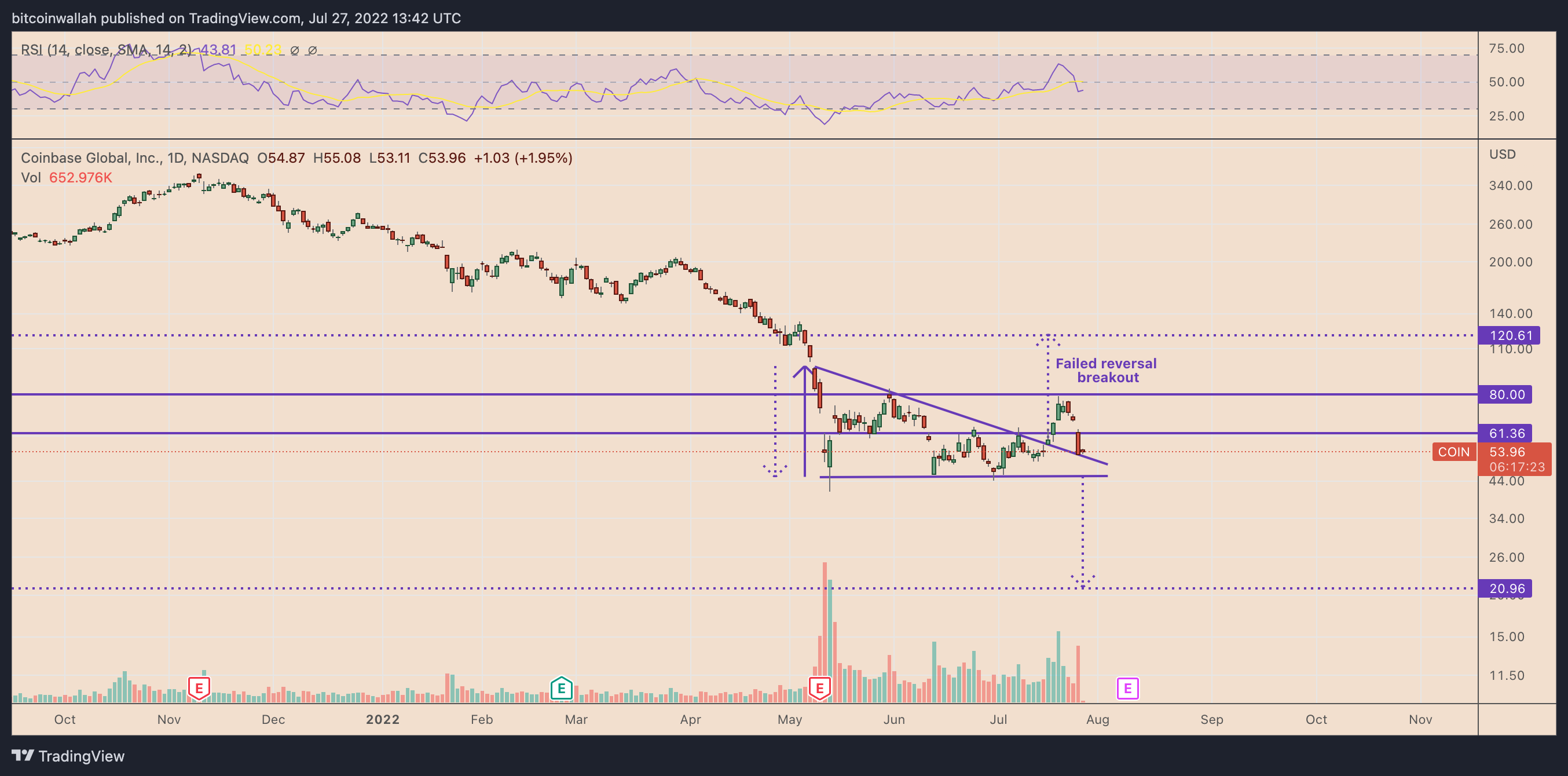 COIN dropped by over 21% to close July 26 at $52.93 while testing the ascending triangle’s upper trendline as support. In the process, COIN wiped out its entire bullish reversal breakout move.