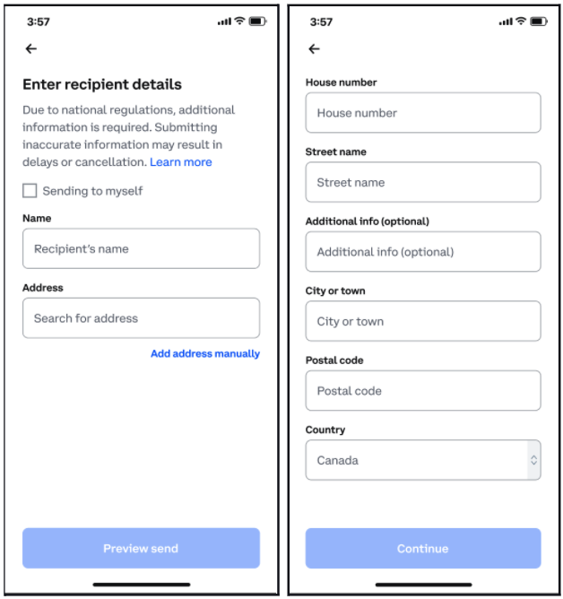As shown in the above screenshot, Canadian users will need to share the full name and residential address of the recipient.