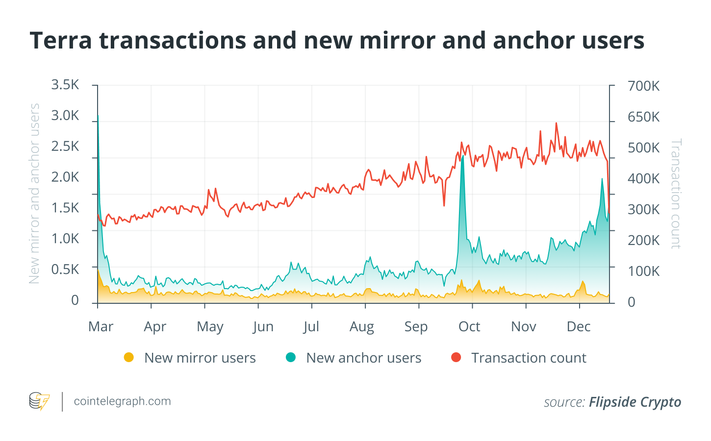 Collateral growth coincides with the expansion of its user base, increasing daily at about 440 users, which, compared to Mirror, is growing at nearly three times the pace. The increase in the user base can also be seen to grow alongside the gradual rise in Terra’s transactions.