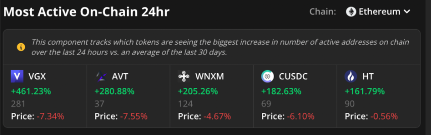 Like all the other dashboard features, the Most Active On-Chain chart had a great week for winning alerts. For instance, on March 11, WNXM was on the chart when it was trading at $18.15. Soon after, its price began to rapidly rise, peaking on March 18 at $25.37, an increase of 59%.