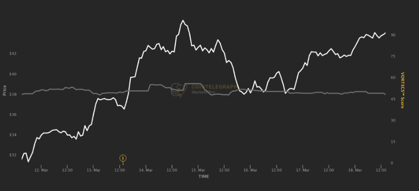 On March 12, AGIX was trading at $0.30 when a score of 77 noted bullish historical patterns for the token. Three days later the price jumped to $0.60, an impressive 100% rise! Scores above 80 also flashed on March 14, when it was trading at $0.40. Traders who bought at this price point could have seen a 50% increase.