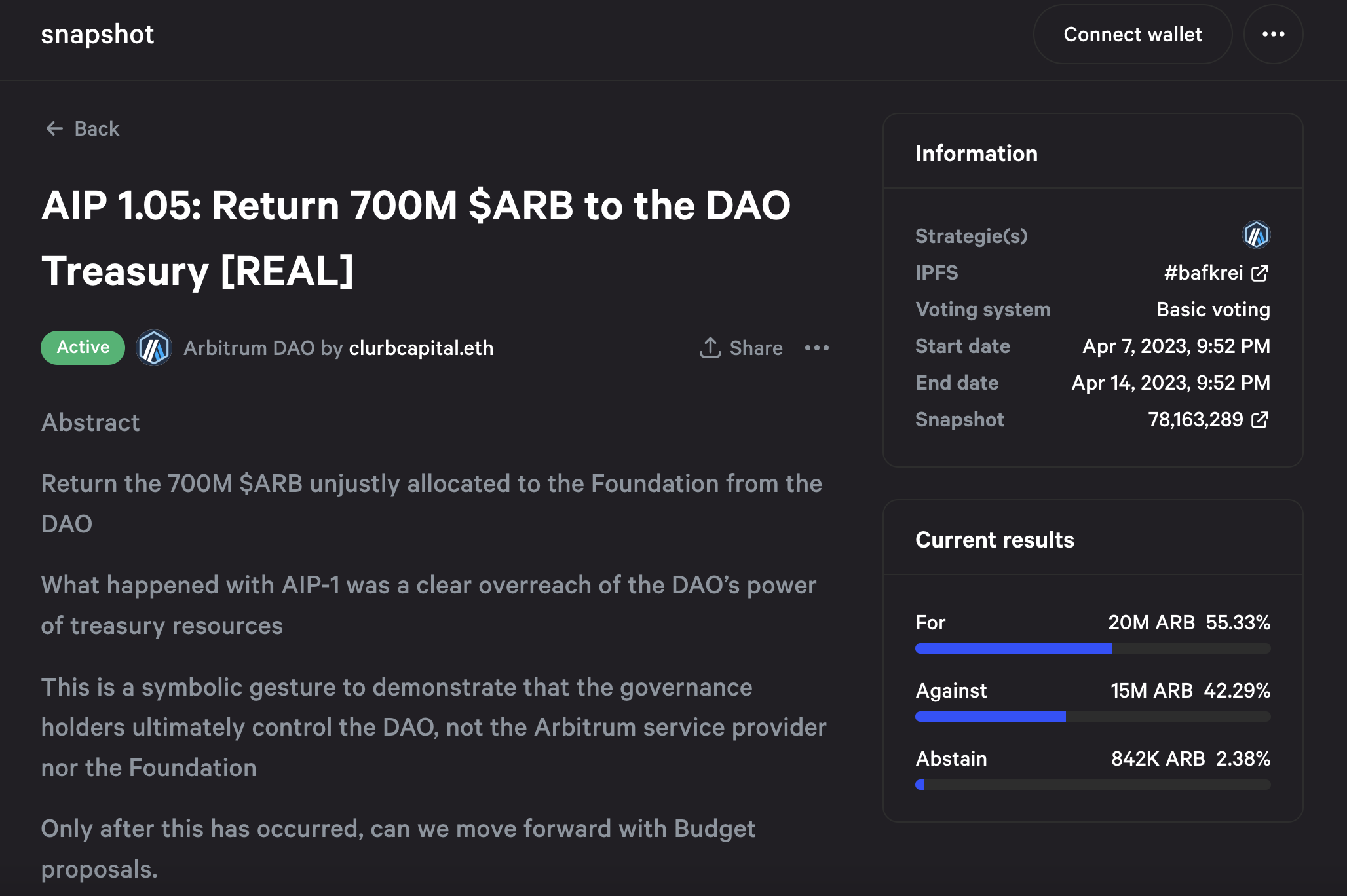 The dispute between Arbitrum’s Foundation and its community started at the end of March, following the Foundation’s first governance proposal (AIP-1) which called for funding its operations with 750 million ARB tokens — worth nearly $1 billion.