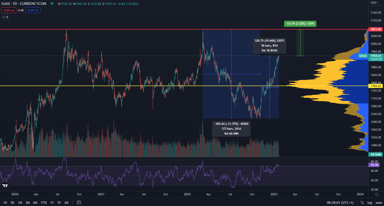 Zlato je pre väčšinu investorov jednoznačnou voľbou predovšetkým v neistých ekonomických časoch. Stále vysoká inflácia spôsobuje prelievanie kapitálu do tejto triedy aktív, ktoré slúži ako dôveryhodné zaistenie. Dokonca podľa údajov z TradingView sa cena čoskoro dotkne nového historického maxima.