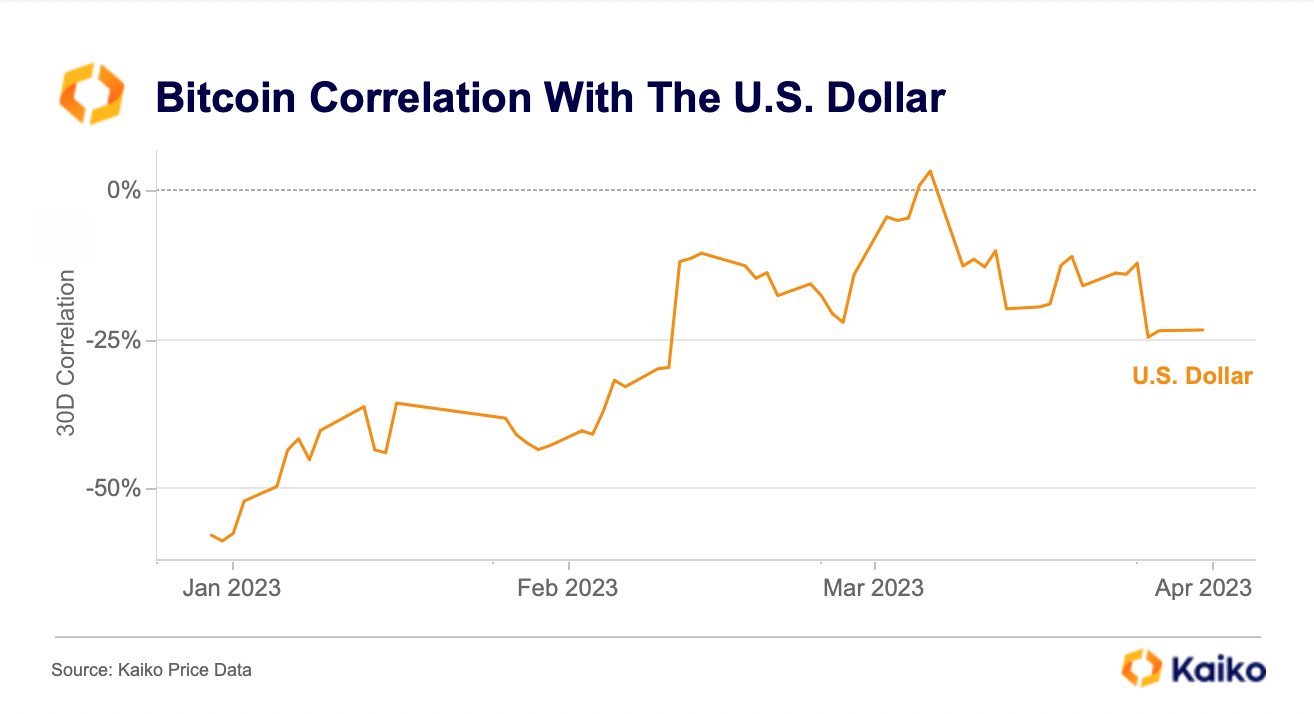 Continuing, Kaiko noted that Bitcoin’s inverse correlation to the U.S. dollar is also rapidly unwinding.