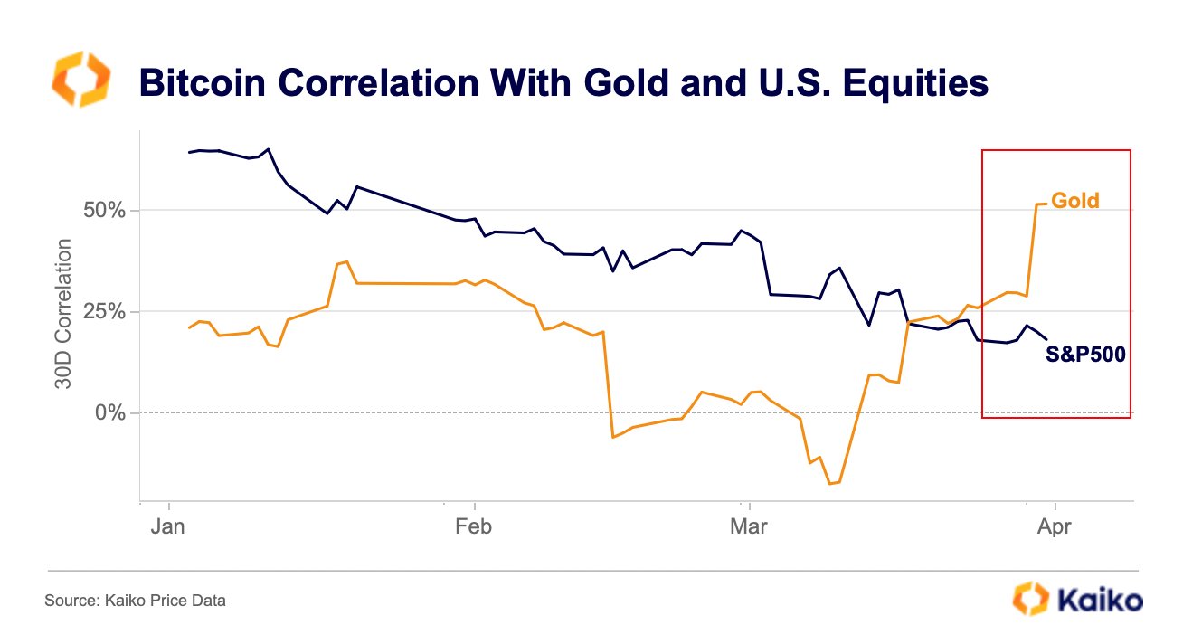 Bitcoin’s correlation with gold, Kaiko revealed last week, is now higher than that with the S&P 500.