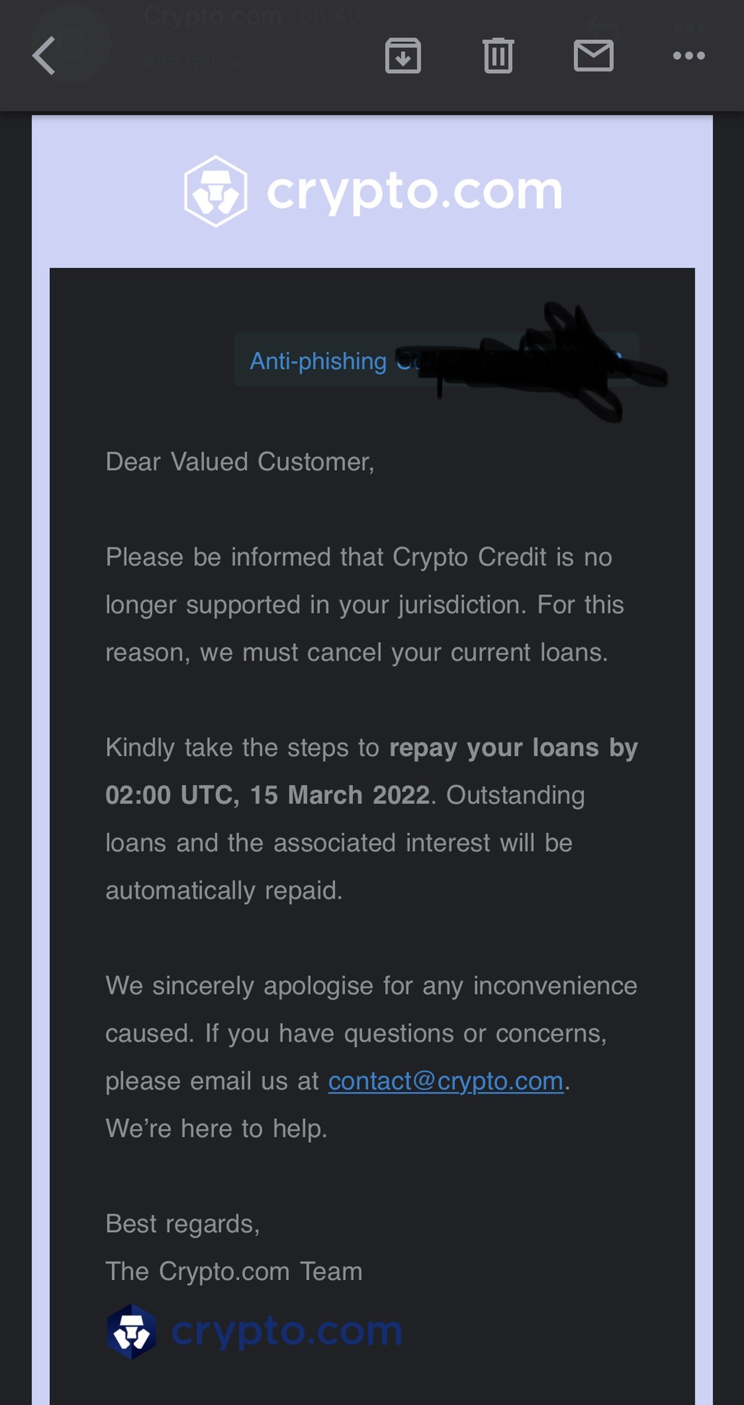 https://images.cointelegraph.com/images/840_aHR0cHM6Ly9zMy5jb2ludGVsZWdyYXBoLmNvbS91cGxvYWRzLzIwMjItMDMvMmQ2NTgxMGMtODNlMC00YzIxLTljZDEtYTZmMDNjOTRkY2QyLmpwZw==.jpgCrypto.com is reportedly giving users from countries restricted from its loan program until March 15 to repay their crypto loans.