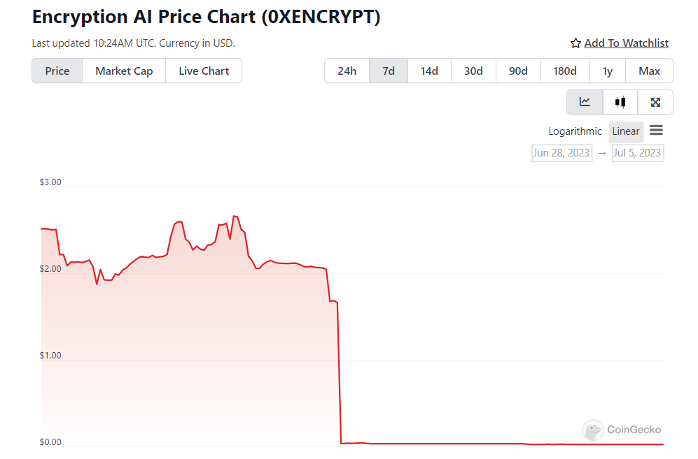 Several investors in the Encryption AI project have reported that its developer performed a rug pull during a liquidity migration event. As a result, the project’s token, 0XENCRYPT, went from trading at around $2.05 to an all-time low of $0.02. Token data aggregator CoinGecko recorded the massive price drop around July 2.