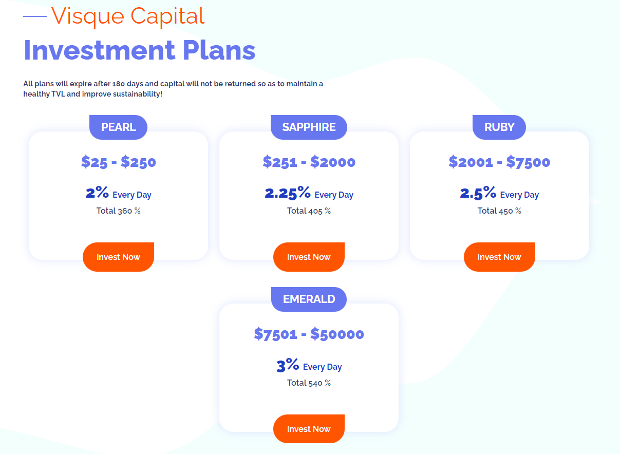 Visque Capital offers a range of investment plans on its website, the most expensive plan claims investors would see returns of up to 3% per day.