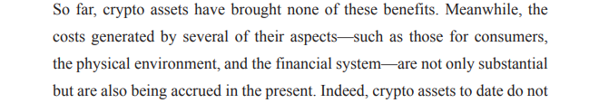 The report’s main argument is that crypto assets fail to deliver on their “touted” benefits, such as improving payment systems, financial inclusion, and creating mechanisms to transfer value and intellectual property, stating: