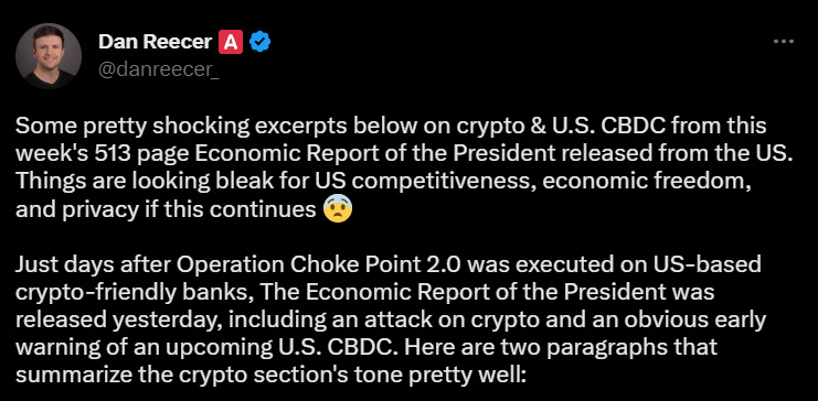 Dan Reecer, chief growth officer at decentralized finance (DeFi) platform Acala Network, claims the report comes “just days” after Operation Chokepoint 2.0 was executed on crypto-friendly banks.