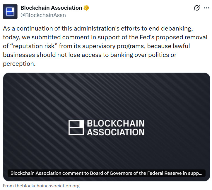 “The Blockchain Association strongly encourages the Board to move expeditiously to finalize and codify the removal of reputation risk from its supervisory framework,” Pinto wrote.
