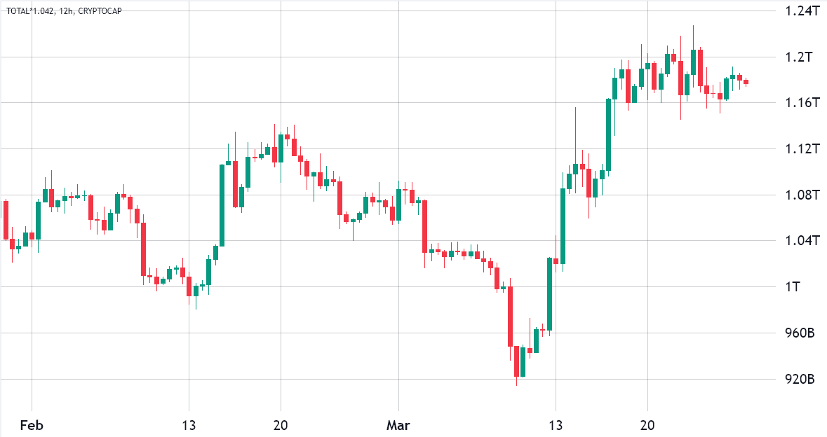 These competing forces may have been the primary reason for cryptocurrencies’ narrow trading range near $1.18 trillion between March 17 and March 27. However, derivatives data presents compelling arguments for a rally toward $1.35 trillion and a retest of the $1 trillion threshold.