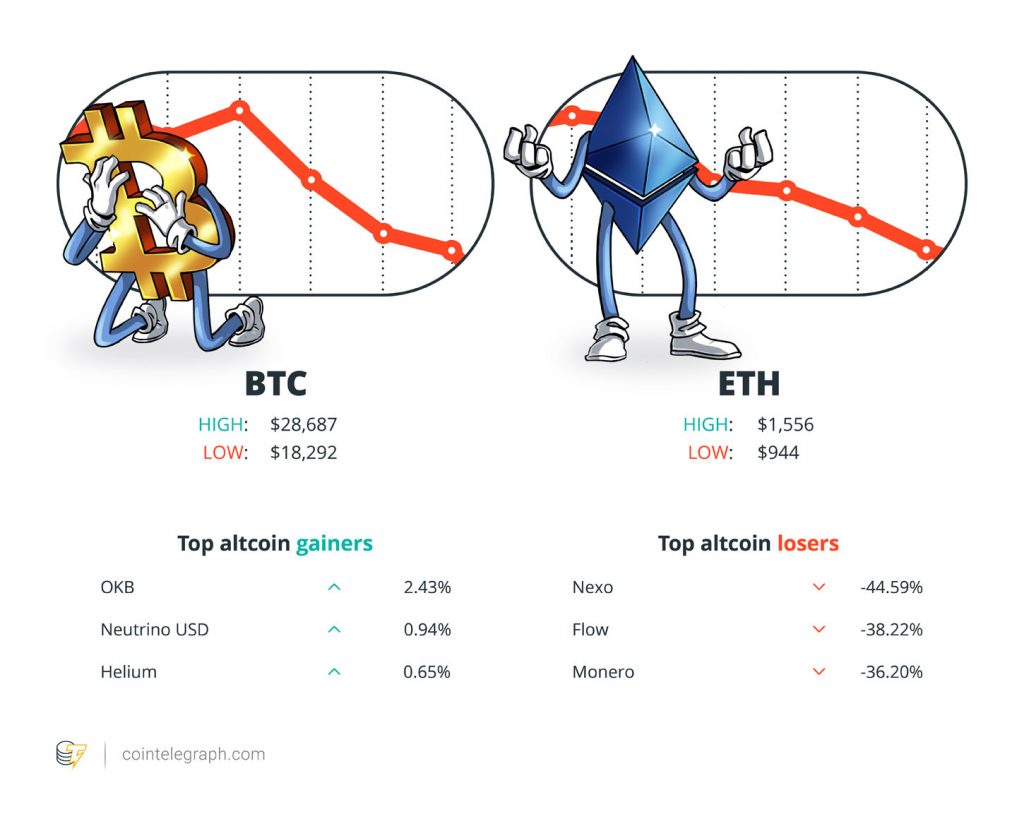 Bitcoin’s price took a steep dive this week, falling from $28,000 to below $21,000, according to Cointelegraph’s BTC price index. The cryptocurrency continued its freefall over the weekend, plunging below $19,000.