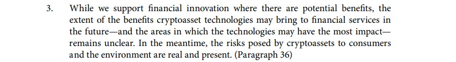In a small win for crypto, the committee said it also recognized the potential for some crypto assets and their underlying technology to bring benefits to financial services and markets — such as reducing the cost of cross-border payments and improving financial inclusion.