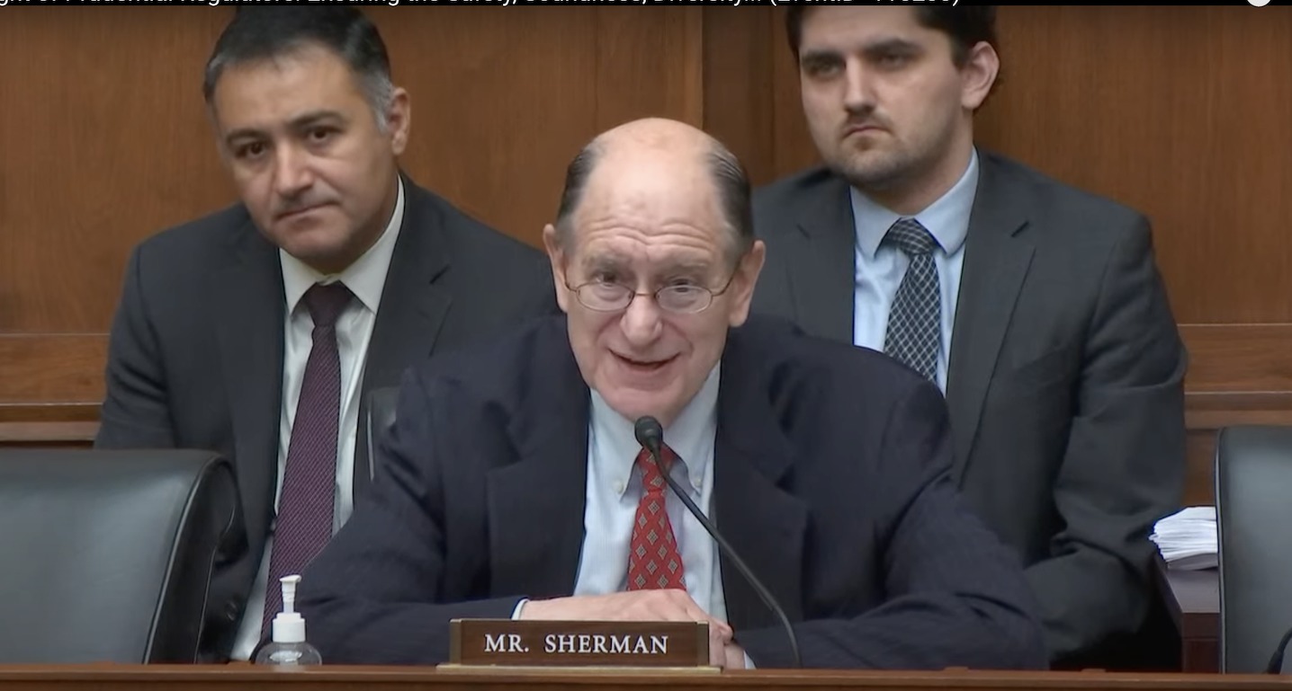 “The crypto billionaire bros are determined to get a light regulator,” said Sherman. “I’m distressed by what I’ve heard from you, gentlemen: guardrails, safe and sound ways to deal with crypto…. you sound like Sam Bankman-Fried, only you’re wearing long pants instead of shorts. What vague pablum.”