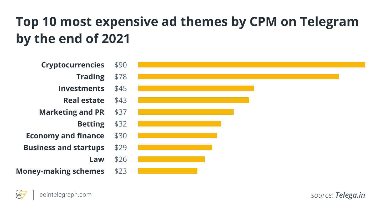 https://images.cointelegraph.com/images/840_aHR0cHM6Ly9zMy5jb2ludGVsZWdyYXBoLmNvbS91cGxvYWRzLzIwMjItMDIvZjRkNzkxZTctM2Q2Ny00MjRkLWE3ZWYtMDQyNTM2OTViZTBhLmpwZw==.jpgCryptocurrency-themed advertising has been growing extremely popular on Telegram, with some ad firms reporting on crypto becoming the most expensive advert type on the platform in 2021.