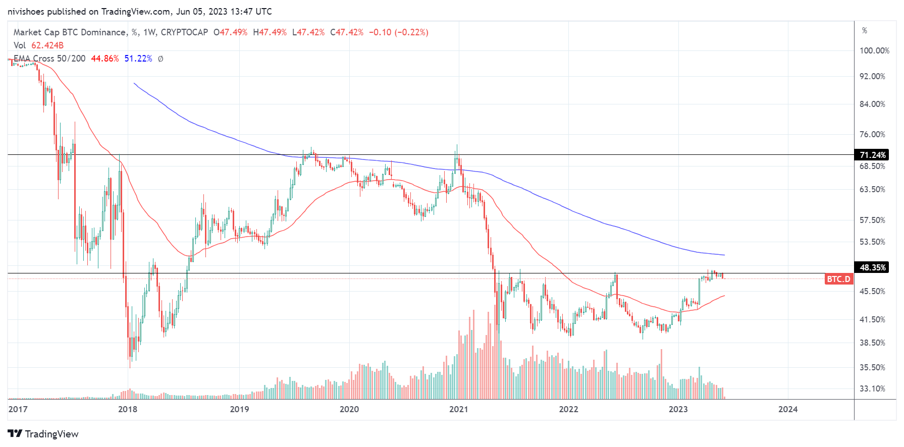 Technically, Bitcoin’s dominance percentage over the crypto market, which measures the share of Bitcoin’s market capitalization in the total crypto valuation, experienced an uptrend in 2023 before encountering resistance at the 48.35% level.