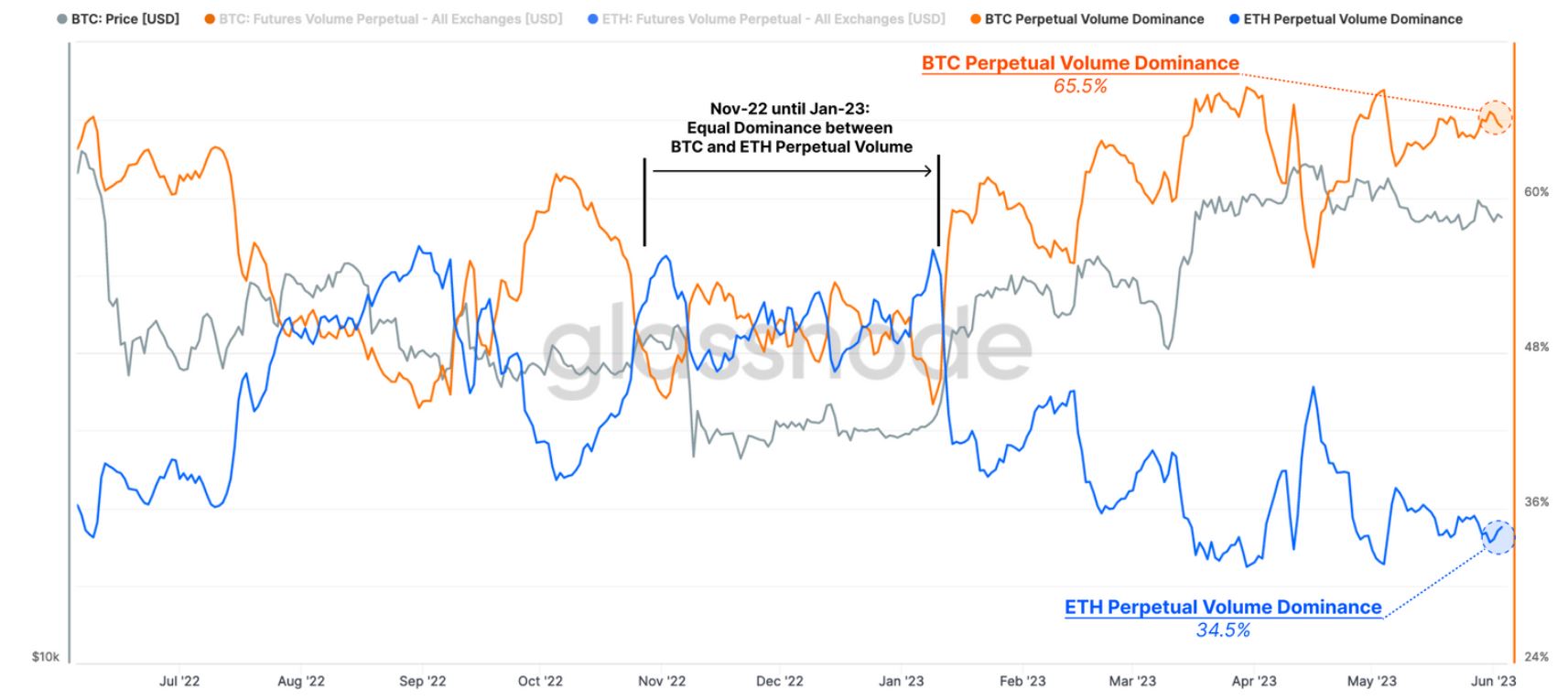 Similarly, the market share for Bitcoin (BTC) perpetuals versus their Ether counterparts shows a huge discrepancy, with 65.5% dominance for Bitcoin. In 2022, the two assets had equal shares in the perpetual swap space. However, the trend has shifted significantly in the last year.