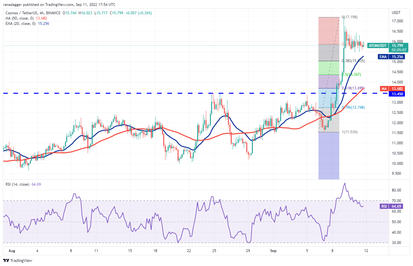 The 4-hour chart shows that the ATOM/USDT pair surged after breaking above the overhead resistance at $13.45. That pushed the RSI deep into the overbought territory and started a correction but a positive sign is that the bulls have not given up much ground.