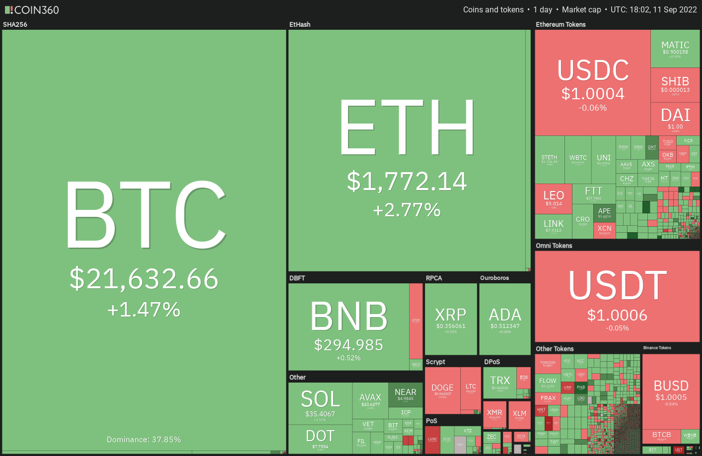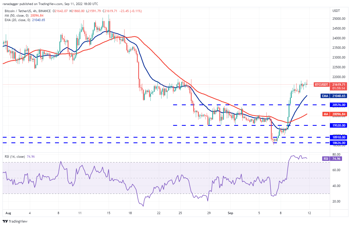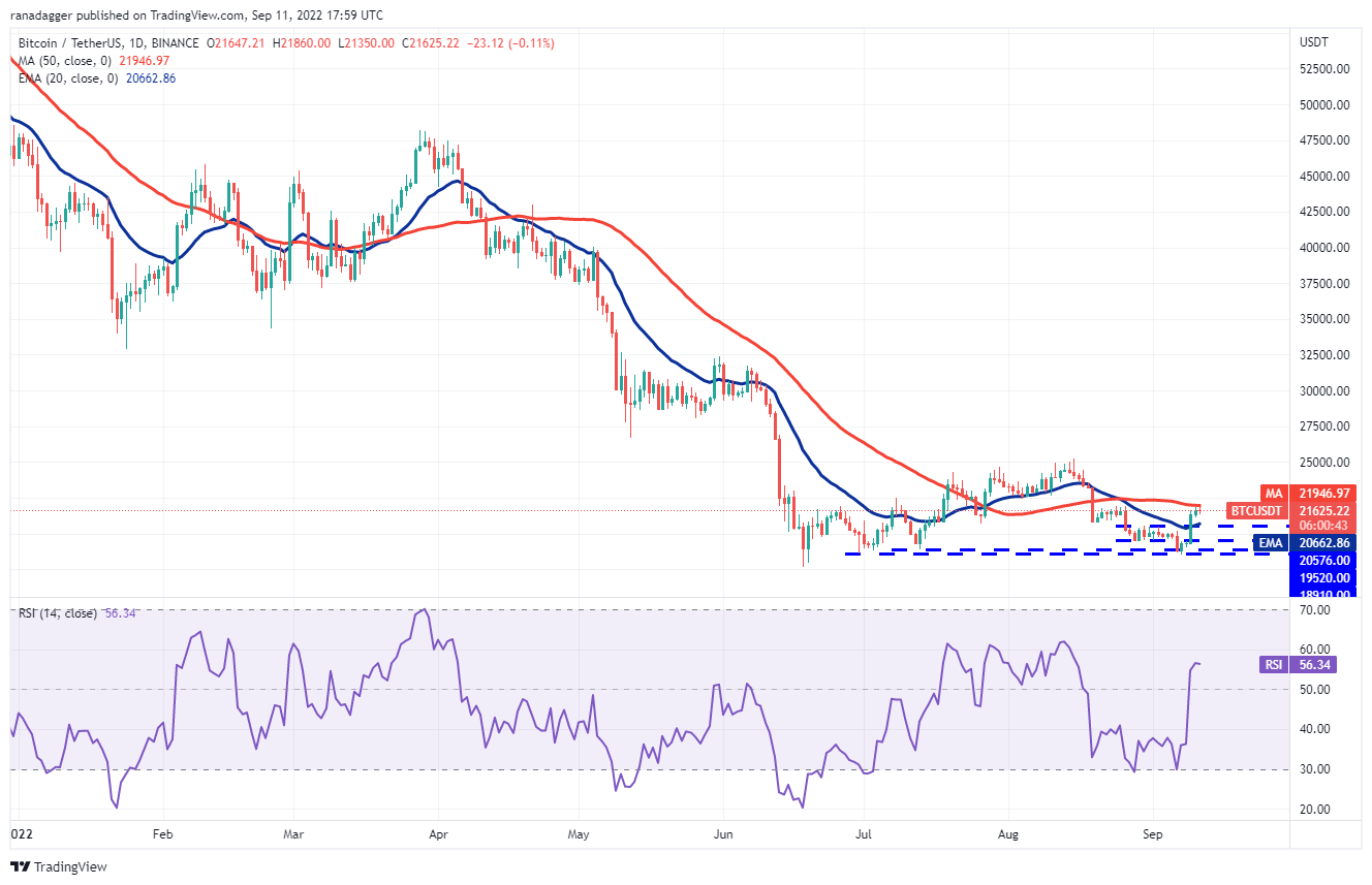 Bitcoin soared above the 20-day exponential moving average ($20,662) on Sept. 9, which was the first indication that the selling pressure could be reducing. The bears are attempting to stall the recovery at the 50-day simple moving average ($21,946) but a positive sign is that the bulls have not given up much ground.