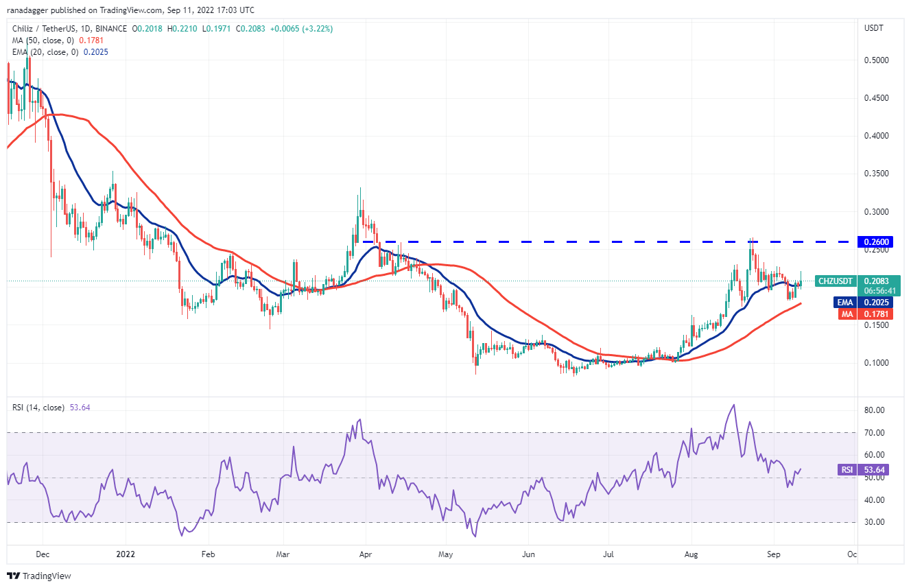 Chiliz (CHZ) broke above the 20-day EMA ($0.20) on Sept. 9, which was the first indication that the corrective phase may be ending. Hence, this token made it to the list.