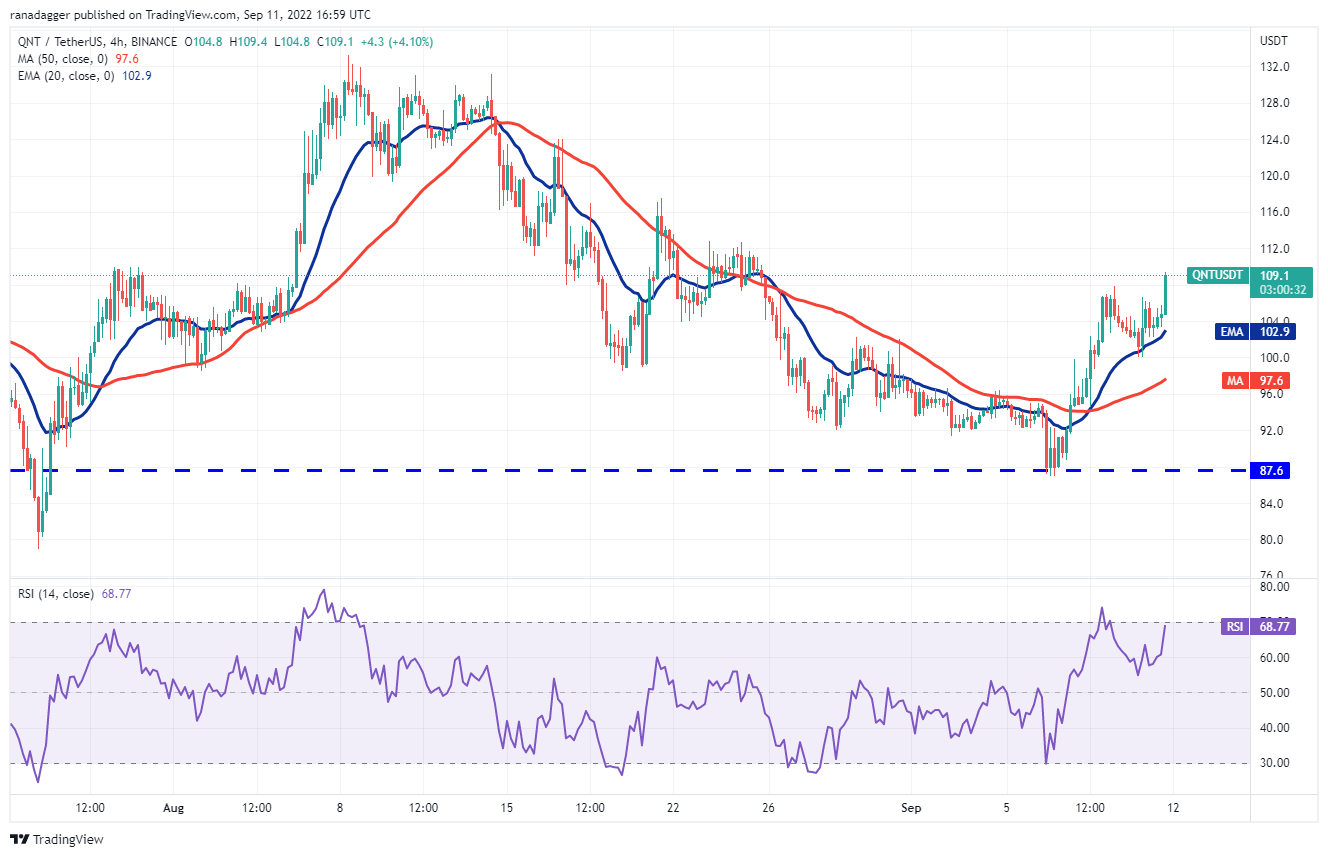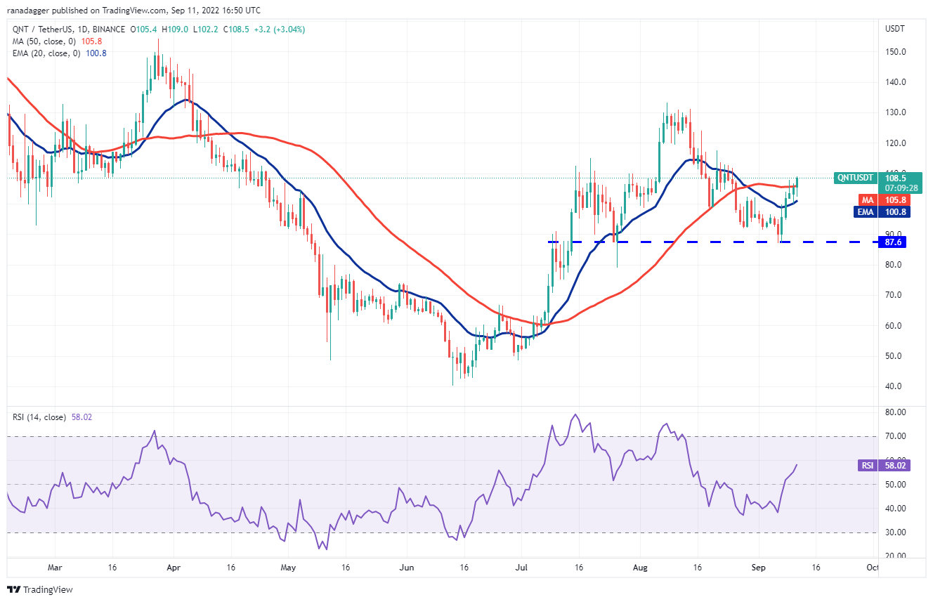 This indicated that the sentiment had turned positive and the bulls are buying on dips. Buyers pushed the QNT/USDT pair above the 50-day SMA on Sept. 11. If bulls sustain the higher levels, the pair could rise to $117 and then to $124. A break above this level could open the doors for a rally to $130.