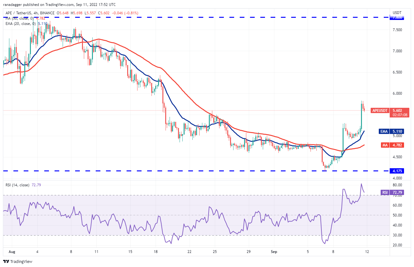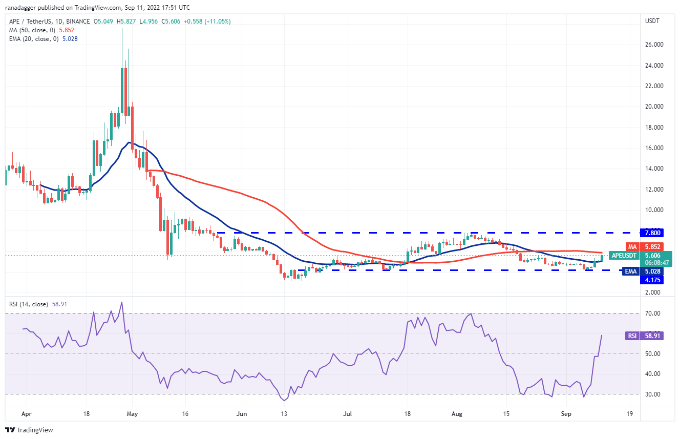 Buyers pushed the price above the 20-day EMA ($5) on Sept. 9 and the APE/USDT pair formed an inside-day Doji candlestick pattern on Sept. 10. This uncertainty resolved to the upside on Sept. 11 with a strong rally to the 50-day SMA ($5.85). The bears may try to stall the recovery at this level.