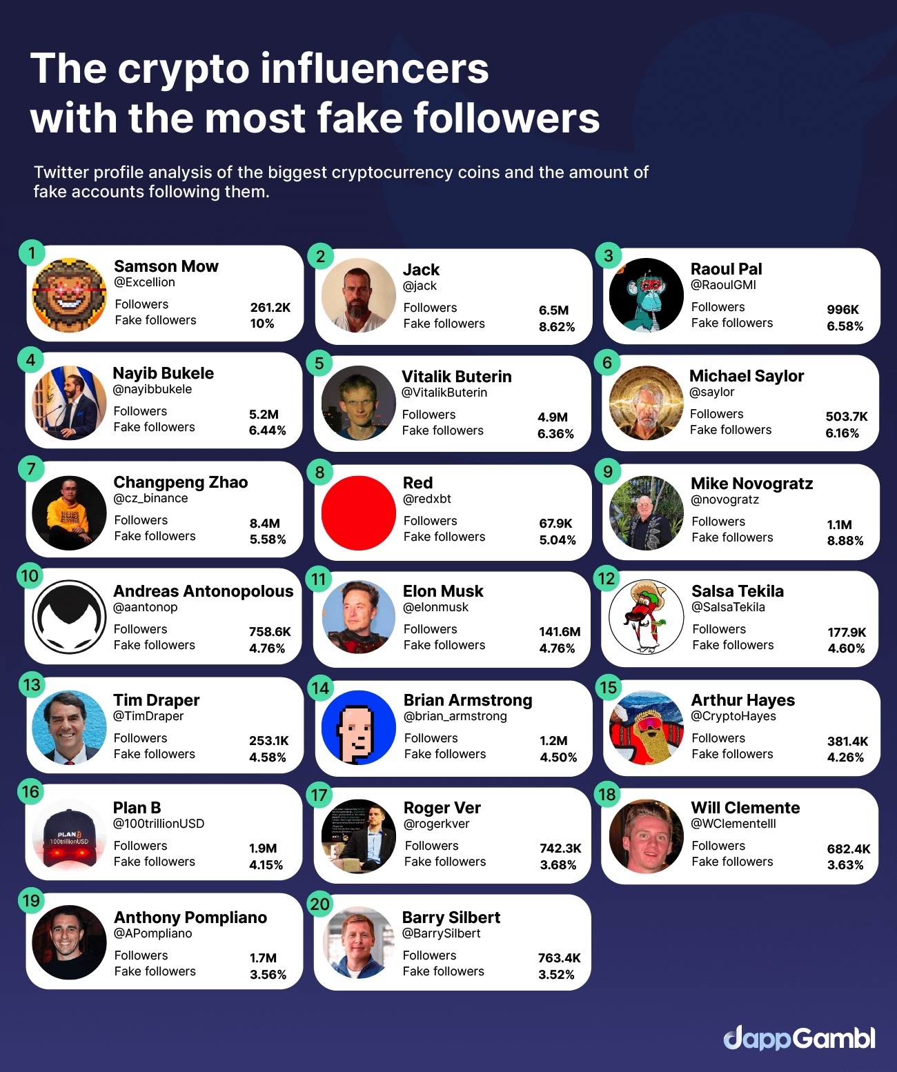 Other prominent figures with substantial fake followers include MicroStrategy co-founder Michael Saylor (6.16%), Binance CEO Changpeng ‘CZ’ Zhao (5.58%) and Tesla CEO Elon Musk (4.76%) among others.