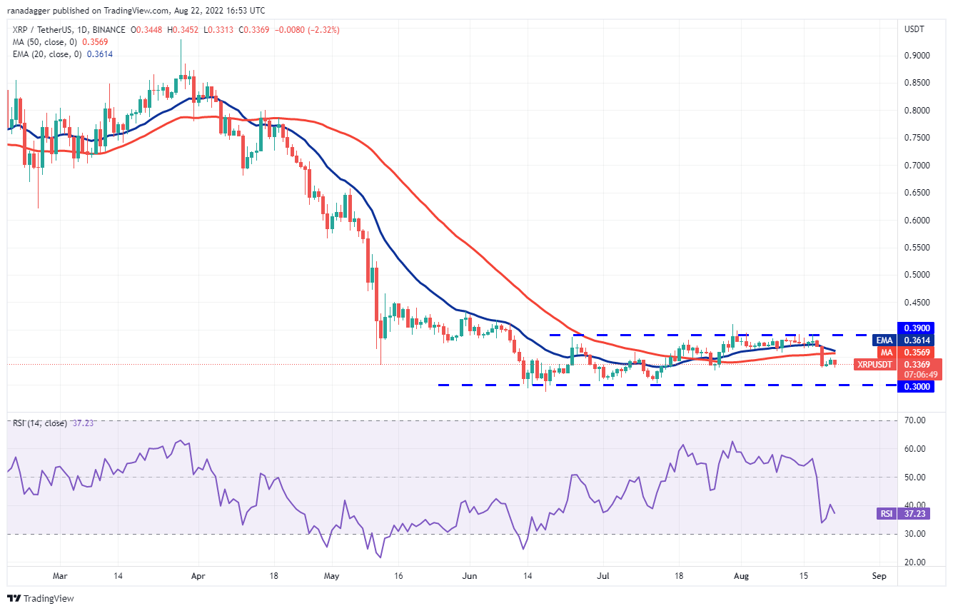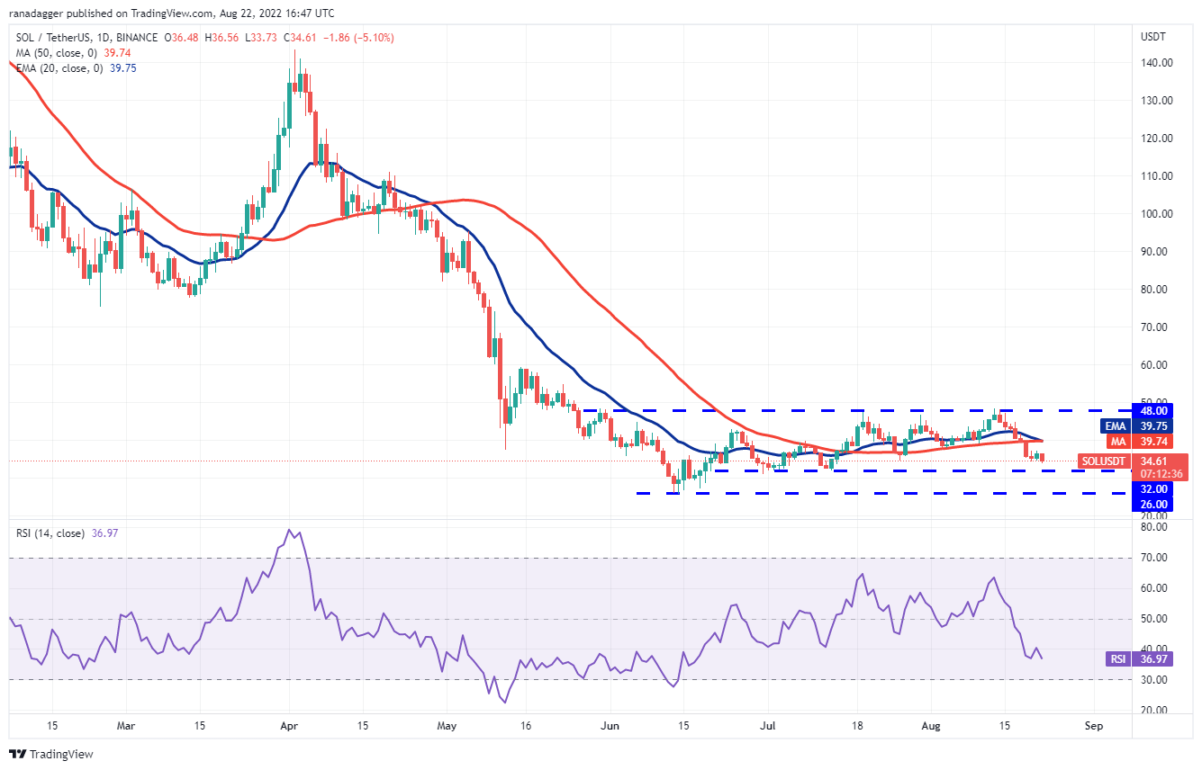 Solana (SOL) broke below the moving averages on Aug. 19, indicating that bears have the upper hand in the near term. The sellers will try to sink the price to the immediate support at $32.