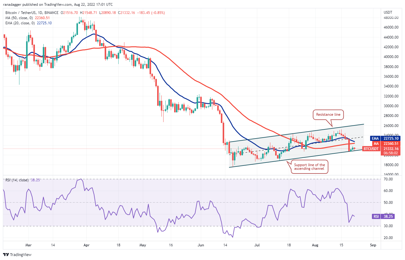 The buyers defended the support line of the ascending channel on Aug. 19 and started a bounce but the recovery stalled at $21,800. This suggests that bears are posing a strong challenge near the moving averages.