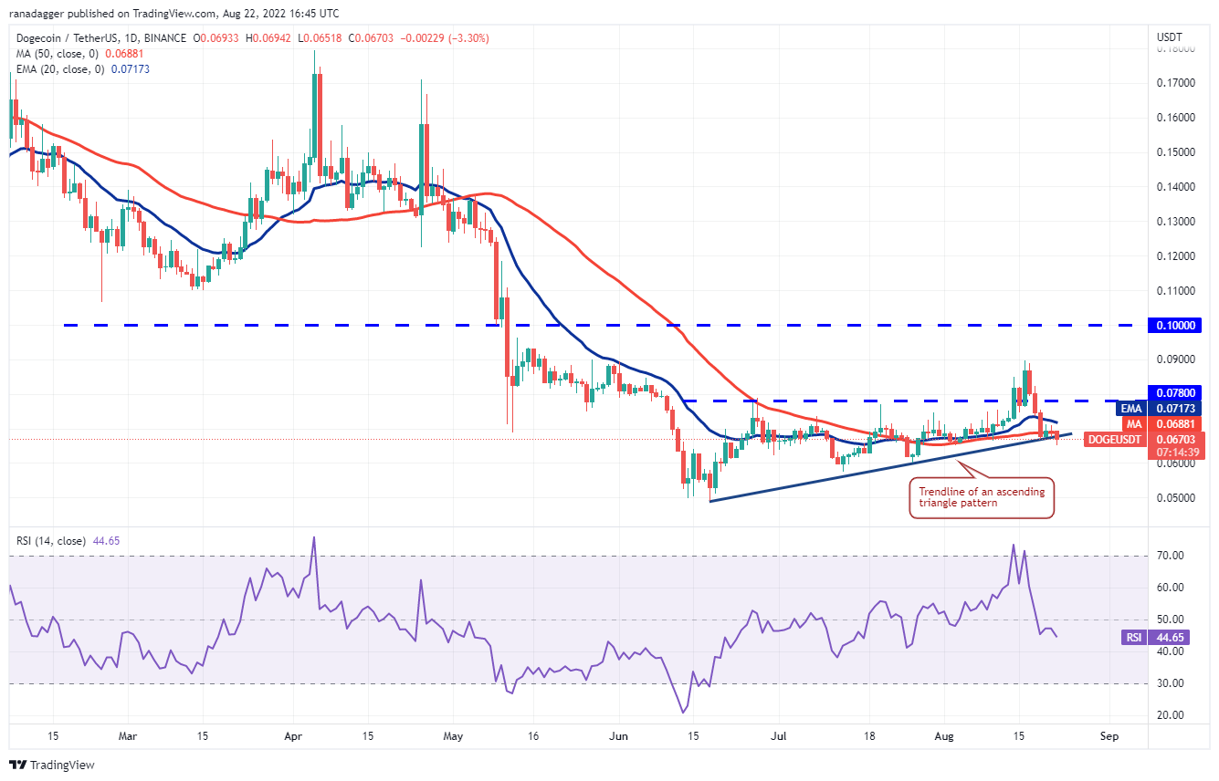 Dogecoin (DOGE) bounced off the trendline on Aug. 20 but the bulls could not clear the overhead hurdle at the 20-day EMA ($0.07). This indicates that bears do not want to surrender their advantage and are selling on minor rallies.