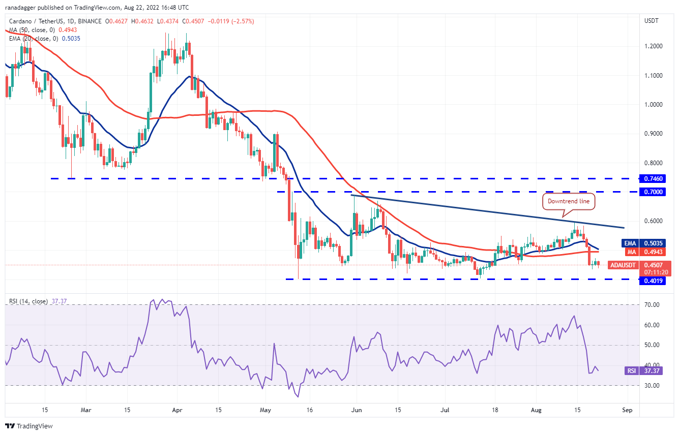 Cardano (ADA) slipped below the 50-day SMA ($0.49) on Aug. 19, indicating that bears have the upper hand. Buyers tried to start a relief rally on Aug. 20 but the weak bounce shows a lack of demand at higher levels.