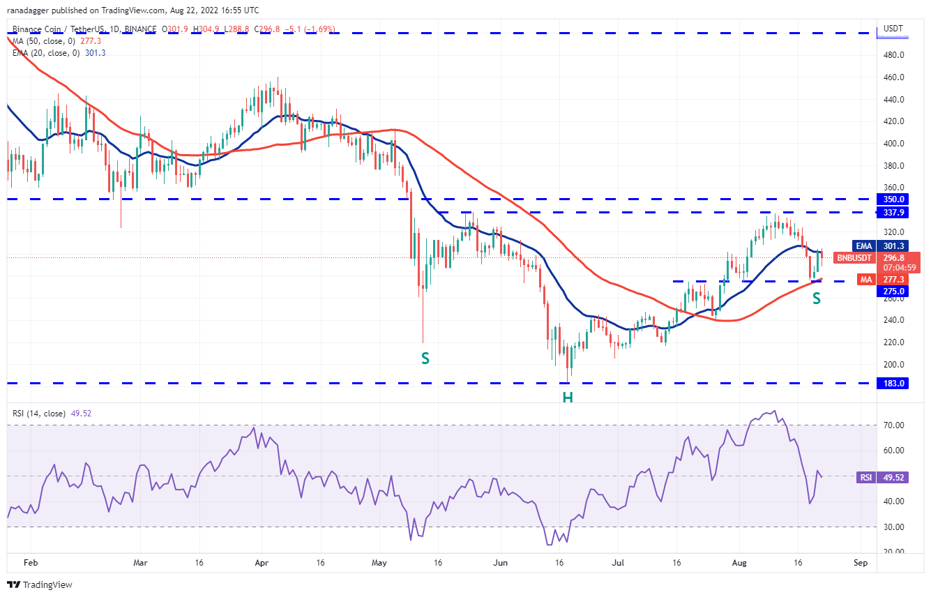 Binance Coin’s (BNB) bounce off the strong support at $275 is facing stiff resistance at the 20-day EMA ($301) but a minor positive is that the bulls have not ceded ground to the sellers. This indicates that buyers expect the recovery to continue further.